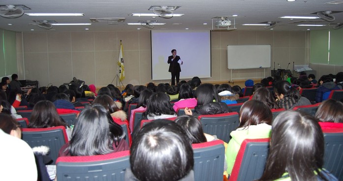 | ▲ 남부서 직원이 인화여중 학생들을 대상으로 안보강연을 하고 있다. | ||