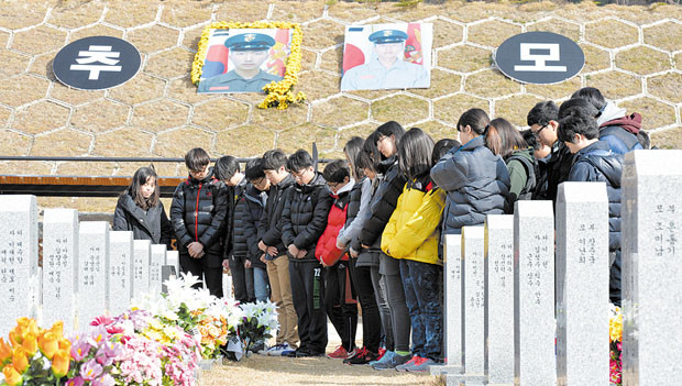 연평도 포격도발 3주기를 앞두고 20일 오전 대전 유성구 국립대전현충원 사병3묘역에서 대전 만년중학교 학생들이 故서정우 하사, 문광욱 일병의 묘비에서 추모하고 있다. 국립대전현충원은 이달 30일까지 추모기간으로 정하고 비석 닦기, 낙엽엽서 보내기, 특별사진전도 함께 진행한다.