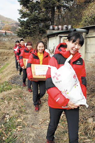 21일 대한적십자사 경기도지사 봉사원들과 IBK 기업은행 사격선수들이 경기 화성지역의 어려운 가정에 전달할 사랑 담긴 선물을 옮기고 있다. 전국은행연합회는 2억3000여만원을 후원, 경기도내 취약계층 6741세대에 백미 1포와 라면1박스를 경기적십자사를 통해 전달했다.