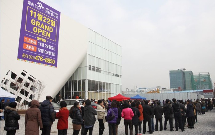 평일 오전 추운 날씨임에도 불구하고 ‘평촌 더샵 센트럴시티’ 견본주택에는 주택 수요자들이 언 손을 녹여가며 일찌감치 모여들었다. 스마트스퀘어 부지에 들어선 견본주택 앞 넓은 공터에도 몇 겹씩 줄을 서서 기다리고 있었다.