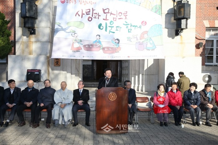 [시민일보]서울 종로구의회 김복동 의장과 박노섭 운영위원장, 최경애 건설복지위원장, 이숙연ㆍ강민경 의원은 지난 21일 독거노인과 저소득 모ㆍ부자가정, 소년소녀가장 등 생활이 어려운 이웃에게 전달하는 '한국종교연합 김장담기'에 참석했다. 사진은 천도교 수운회관에서 축사를 하고있는 김복동 의장의 모습.