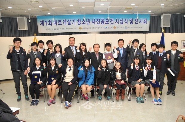 [시민일보]지난 22일 경기 김포평생학습센터는 바르게살기운동 3대 이념 '진실' '질서' '화합'의 테마로 '제1회 바르게살기운동 청소년 사진 공모전 시상식 및 작품전'을 열었다. 사진은 행사에 참가한 유영록 김포시장, 이선일 바르게살기협회 김포시협의회장과 학생들 모습.