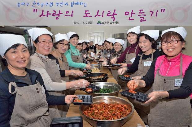 [시민일보]지난 22일 서울 송파구 여성문화회관에서는 '솔향기회' 회원 30명이 ‘사랑의 도시락 만들기’ 행사를 열고 어려운 이웃 200명에게 직접 만든 ‘엄마표 도시락’을 전달했다. 사진은 조리실에서 도시락을 만들고 있는 솔향기회 회원들의 모습.