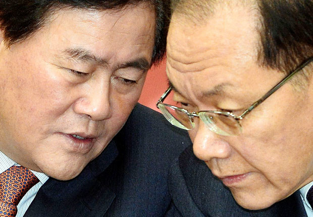 새누리당 황우여 대표와 최경환 원내대표가 25일 오전 서울 여의도 국회에서 열린 최고위원회의에서 대화를 나누고 있다.