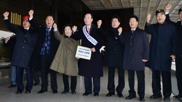 | ▲ 박세환(가운데) 대한민국재향군인회 회장과 관계자가 26일 오후 서울 서초구 서초동 서울중앙지방검찰청에서 천주교 정의구현사제단 박창신 신부에 대한 고발장을 제출하기 전 구호를 외치고 있다. | ||