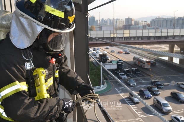 서울 강남소방서는 지난 26일 강남구 삼성동 본서에서 고층건물 화재진압훈련을 실시했다. 이번 훈련은 고층건물 화재 발생시 신속한 화재진압을 위해 출동대별로 임무를 부여해 실전을 방불케 했다. 사진은 화재진압훈련을 하고 있는 소방대원의 모습.