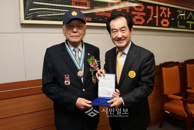 경기 의정부시는 6.25전쟁 정전 60주년을 맞아 지난 25일 시청에서 6.25참전유공자 대표 30명에게 '호국영웅기장'을 수여했다. 이번 전수식은 정전 60주년을 기념하고 6.25참전유공자들의 호국정신을 기리기 위해 개최됐다. 사진은 김상희 6.25참전 유공자회 의정부시지회장과 유병용 의정부시장의 모습.