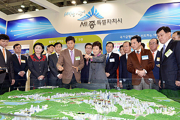 박근혜 대통령이 27일 부산 해운대구 벡스코(BEXCO)에서 열린 ‘2013 대한민국 지역희망박람회 개막식’을 마친 후 각 지역전시장 내 세종특별자치시 전시관에서 조감도를 살펴보고 있다.