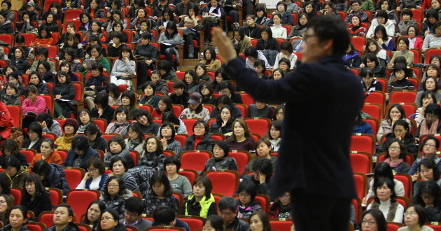 27일 오후 경기 수원 아주대 종합관에서 고 1~2학년 학부모 대상으로 열린 2015~16학년도 대입전형 등 변화된 대입제도와 대비 방법 설명회에서 경기도교육청 대입상담교사의 설명을 참석한 학부모들이 진지한 표정으로 듣고 있다.