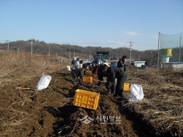 [시민일보]지난 26일 경기 연천군 군남면 주민자치위원 및 면직원 35명은 불우이웃 돕기 기금 마련을 위해 자주색 돼지감자를 수확했다. 수확한 감자는 주민자치위원들이 판매한 후 수익금을 연말 지역내 소외된 이웃을 위해 사용할 계획이다. 사진은 감자를 수확하고 있는 주민들의 모습.