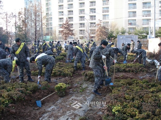 [시민일보]경기 고양시는 지난 27일 9사단 장병들과 고양지구협의회 봉사원 등 80여명과 함께 가로변 화분 수거 후 폐기 예정이었던 국화를 하천변에 식재해 약 1500만원의 예산절감 효과를 보았다. 사진은 9사단 군부대 장병들이 화단에 국화를 심고 있는 모습.