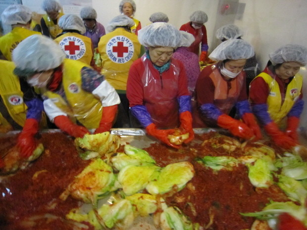 대한적십자사 봉사회 마포지구협의회는 지난 27일 서울 마포구 도화동 현대홈타운 경로당에서 열린 겨울 맞이 '사랑의 김장 나눔' 행사에서 지역내 밑반찬 지원가구 및 홀몸노인 등 총 200가구에 전달할 김장김치를 담갔다. 사진은 행사에 참여해 김장을 담그고 있는 봉사단원의 모습.