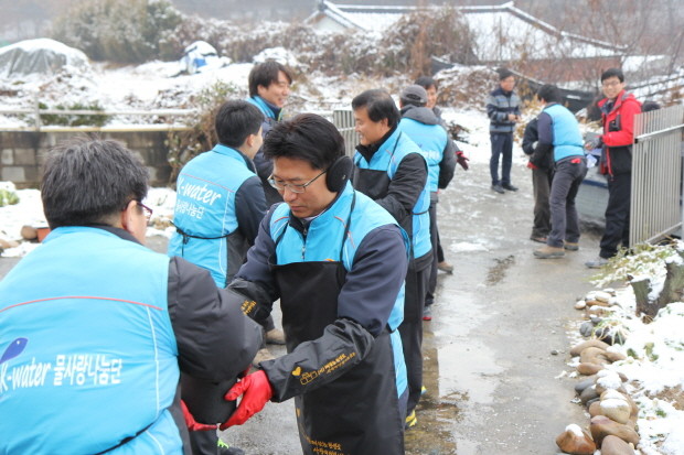 K-water 한강통합물관리센터 직원들은 지난 27일 겨울철을 맞아 취약계층 주민에게 연탄을 전달하는 '사랑의 연탄 나누기' 행사를 했다. 이 날 행사에 참여한 15명의 직원들은 여주시 단현동과 신진동에 거주하는 취약계층 가정에 3000장의 연탄을 직접 전달했다. 사진은 행사에 참여한 한강통합물관리센터 직원들의 모습.