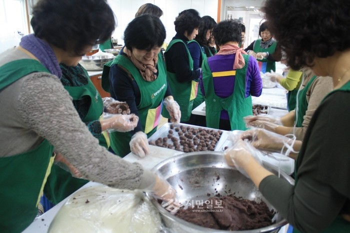 [시민일보]경기 화성시쌀가공연구회는 지난 27일 연말을 맞아 ‘사랑의 떡나눔 행사’를 열었다. 이날 회원들은 직접 재배한 쌀과 팥으로 찹쌀떡을 만들어 장안면 지역내 홀몸노인 40여가구에 전달했다. 사진은 떡을 만들고 있는 회원들의 모습.