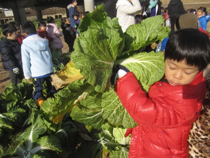[시민일보]구로구는 지난 28일 안양천 어린이 자연학습장에서 어린이 농작물 수확 체험 행사를 진행했다. 이날 수확한 배추는 각 어린이집으로 전달돼 어린이 김장체험 재료로 사용된다. 사진은 배추를 수확하고 있는 한 유치원생의 모습.