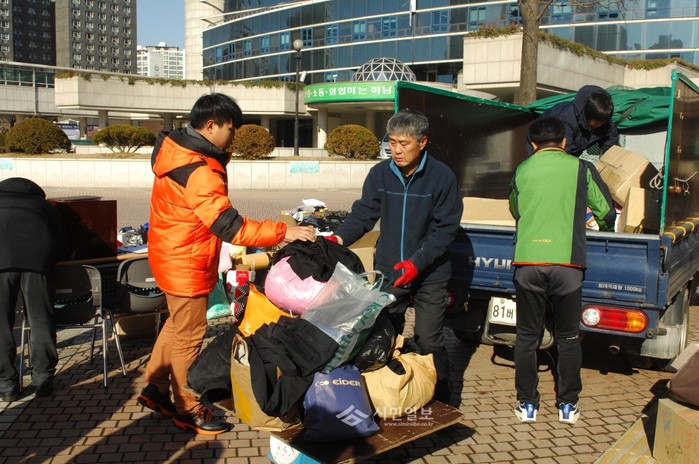 [시민일보]지난달 29일 경기 하남시자원봉사단체협의회에서는 태풍 하이옌의 피해를 입은 필리핀 주민들의 구호물품을 지원하기 위해 헌옷 및 성금 기증식을 열었다. 이번에 모인 헌옷 수거량은 4540㎏, 성금은 총 301만원이고 성금과 물품은 국제구호기구인 월드비전을 통해 전달될 예정이다. 사진은 헌옷을 수거하고 있는 봉사자들의 모습.