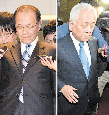 새누리당 황우여 대표와 민주당 김한길 대표가 2일 오후 서울 여의도 국회 귀빈식당에서 진행된 정국 정상화를 위한 여야 4자회담을 마친 뒤 취재진 질문을 받으며 이동하고 있다. 여야 지도부의 4자회담은 성과없이 종료되어 오는 3일 오전 다시 재개하기로 결정했다.