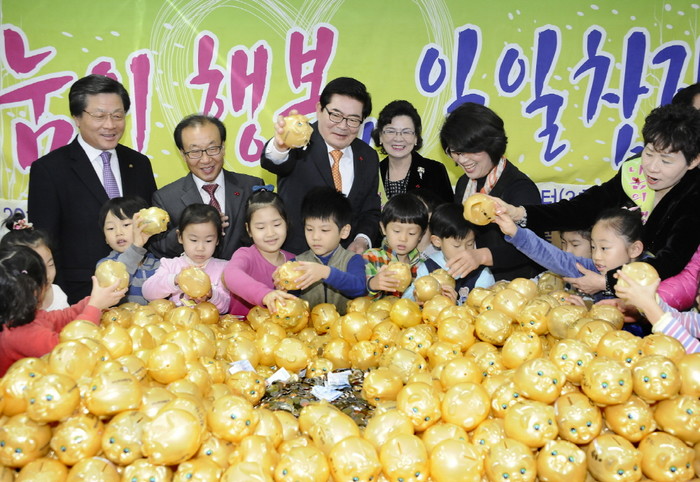 3일 구의2동 주민센터에서 지역내 어린이집 원아들과 주민들이 모은 돼지저금통 1004개를 개봉하는 '한마음 천사(1004) 사랑의 저금통 나누기' 행사가 열렸다. 이날 모은 수익금은 '2013 희망온돌 따뜻한 겨울나기' 사업에 기탁할 예정이다. 사진은 행사에 참여한 김기동 광진구청장(뒷줄 왼쪽 세번째)과 어린이들의 모습.
