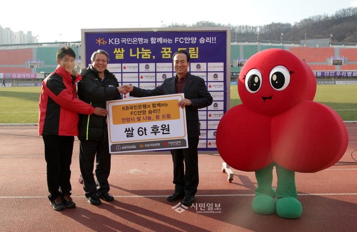 [시민일보]KB와 FC안양은 지난 30일 경기 안양종합운동장에서 '쌀나눔 꿈드림' 전달식을 열었다. 이번 전달식에서는 KB가 FC안양이 홈경기 승리 때마다 쌀 1톤을 기부하기로 한 프로젝트의 일환으로 올 시즌 6승을 거둔 FC안양에게 쌀 6톤을 기부했다. 사진은 행사에 참여한 (왼쪽부터) 김진곤 사랑의 열매 모금사업팀장, 최대호 FC안양구단주와 강문호 KB스포츠단장 모습.