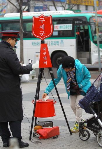 구세군 자선냄비 거리모금이 시작된 2일 오후 경기 성남시 분당구 야탑역 앞 거리에 나온 자선냄비에 시민들의 온정이 쌓이고 있다. 구세군 자선냄비본부는 55억원 모금을 목표로 전국 350여 곳에서 자선냄비 거리모금을 시작했다고 밝혔다.
