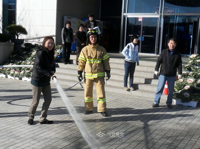 [시민일보]인천공단소방서 동춘119안전센터에서는 지난 3일 오후 연수구 동춘동에 위치한 인천여성회관을 방문해 공공기관 합동소방훈련을 실시했다. 이날 훈련은 119신고요령과 함께 신속한 인명대피요령, 소화기 및 옥내소화전 사용법 등 화재발생시 초기 대응 방법을 훈련했다. 사진은 인천여성회관 직원이 건물내 소방호수 이용방법을 직접 체험해보고 있는 모습.