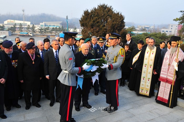 [시민일보]지난 4일 오후 국빈 방한 중인 카롤로스 파풀리아스 그리스 대통령이 경기 여주시 가남면 영동고속도로방면 여주휴게소에 위치한 그리스군 6.25 참전 기념비 헌화식에 참석했다. 헌화식은 그리스 정교회 의식에 따라 진행됐다. 사진은 헌화를 하는 파풀리아스 대통령의 모습.