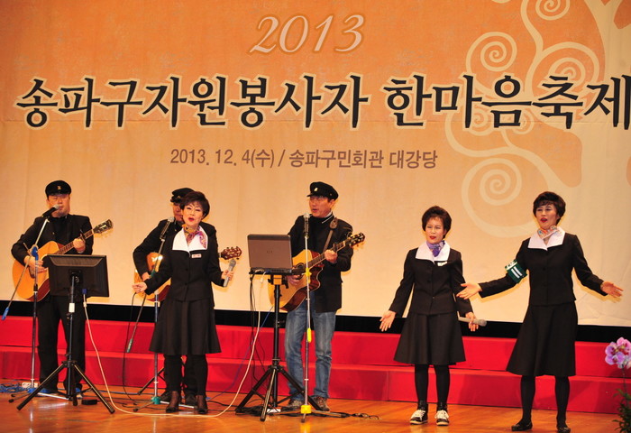 서울 송파구는 지난 4일 송파구민회관 대강당에서 지역을 위해 힘쓴 봉사자들을 위한 ‘2013 송파구 자원봉사자 한마음축제’를 개최했다. 사진은 한마음 축제에서 교복을 입고 7080가요 노래를 부르고 있는 자원봉사자들의 공연 모습.