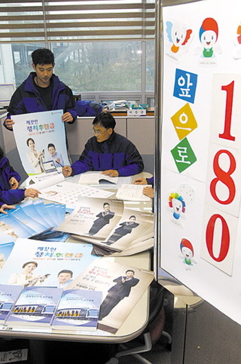 제6회 전국 동시 지방선거를 180일을 하루 앞둔 5일 오후 경기 수원 경기도선거관리위원회에서 직원들이 공명선거 홍보 포스터와 교재 등을 살펴보고 있다.