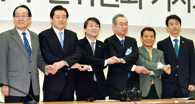 무소속 안철수 의원이 8일 오전 서울 여의도 국회 의원회관에서 열린 국민과 함께 새정치추진위원회 기자회견에 앞서 소통위원장 및 공동위원장들과 함께 손을 맞잡고 있다. 오른쪽부터 소통위원장인 무소속 송호창 의원, 공동위원장인 윤장현 광주비전21 이사장, 박호군 한독미디어대학원대학교 총장, 안 의원, 공동위원장인 김효석 전 의원, 이계안 2.1 연구소 이사장.