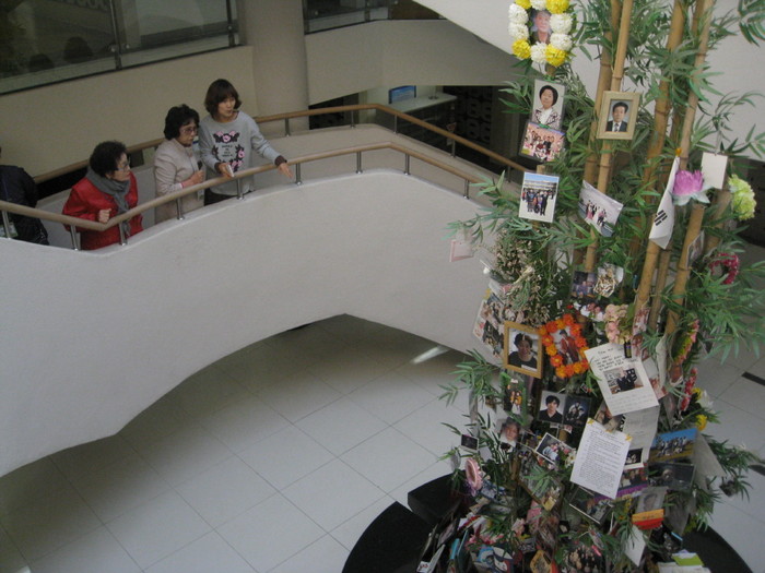 | ▲ 지난 11월18일 서울시립승화원에서 실시된 '아름다운 여행' 참가자들이 나무에 전시된 편지들과 사진들을 감상하고 있다. | ||