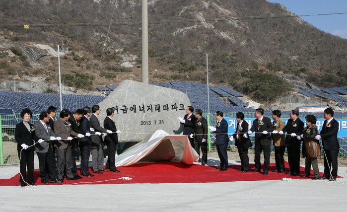 10일 전남 고흥군 금산면 어전리 폐석산 부지에 건설한 친환경 에너지 단지 '거금에너지테마파크'에서 제막식이 열리고 있다. 군유지인 이곳은 680억원의 민간자금을 들여 폐석산 부지 58만5629㎡ 가운데 31만6622㎡를 복원했으며 국내 최대 규모인 25MW급 태양광발전소 및 부대시설을 설치했다.