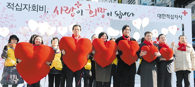 대한적십자회가 10일 오전 서울 중구 명동예술극장 앞에서 ‘2014년도 적십자회비 모금 캠페인 론칭행사’를 연 가운데 유중근 대한적십자회 총재를 비롯한 참석자들이 기념사진을 촬영하고 있다.