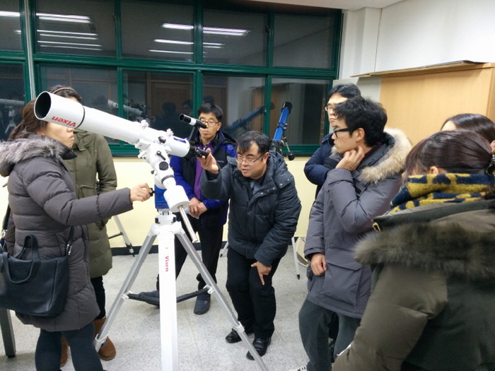 경기도연천교육지원청은 지난 10일 경기도학생연천야영장에 설치된 천문대에서 지역내 초·중·고교 교사 50명을 대상으로 천문교육의 이해와 천체교육의 적용방향 등에 대해 토의하는 등 천문교육 연수를 실시했다. 사진은 직접 천체망원경을 조작해보는 참석자들의 모습.