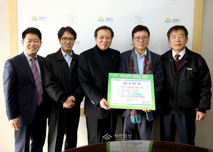 [시민일보]서울 금천구는 지난 11일 금천구청 9층 구청장실에서 (주)EMW의 연말 이웃돕기 성품 약 1000만원 상당을 전달했다. 전기장판, 라면 등의 성품은 지역내 저소득 주민 120가구에 전달될 예정이다. 사진은 성품 전달식 후 차성수 구청장(가운데) 및 관계자들이 단체사진을 찍는 모습.