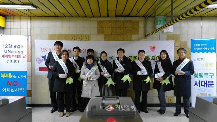 [시민일보]지난 9일 서울 서대문구 구청 직원들로 조직된 청렴동아리 O2(오늘도 투명하게)가 '세계 반부패의 날'을 맞아 지역내에 청렴 분위기를 확산시키고 구의 공익제보시스템을 알리기 위한 홍보 캠페인을 실시했다. 사진은 홍제역에서 캠페인을 한 서대문구 직원들의 모습.