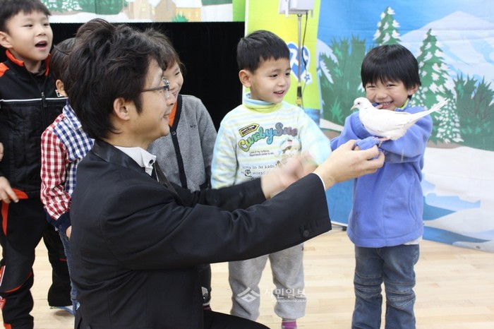[시민일보]경기 아산흰돌유치원은 지난 11일 전체 교직원, 유아 및 학부모를 대상으로 '매직 어린왕자' 공연 전문단체의 매직쇼와 인형극을 실시했다. 사진은 '매직 어린왕자' 김영곤 대표가 유치원생들에게 특별공연을 하고 있는 모습.