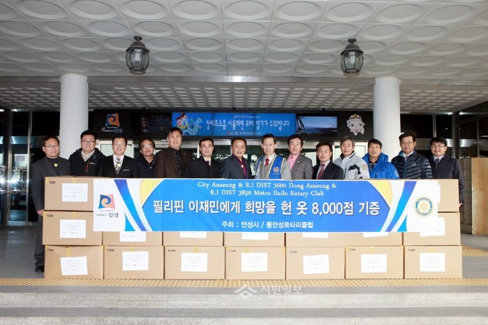 [시민일보]최근 경기 안성시는 태풍 하이옌으로 막대한 피해를 입은 필리핀 타클로반시에 지원할 헌 옷 약 8300벌을 동안성로타리클럽에 전달했다. 동안성로타리클럽은 전달받은 헌 옷을 내주초 필리핀 현지 로타리클럽에 전달할 예정이다. 사진은 황은성 안성시장(가운데)과 동안성로타리클럽 회원들 모습.
