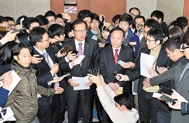12일 서울 여의도 국회 정론관에서 국정원 개혁특위 김재원 새누리당 간사, 문병호 민주당 간사가 국정원으로부터 보고받은 자체개혁안 내용을 발표한 뒤 취재진 질문에 답하고 있다.