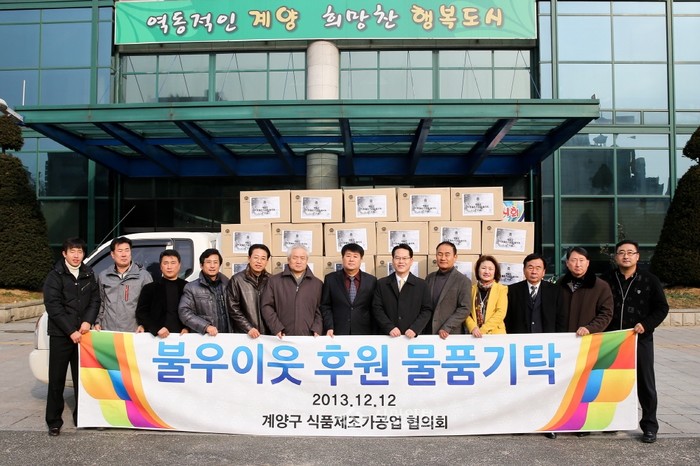 [시민일보]인천 계양구 식품제조가공협의회 21개 회원사는 지난 12일 계양구청에서 불우이웃돕기 후원물품을 구청에 전달했다. 진미푸드 등 회원사는 이날 김치, 참기름, 된장, 즉석조리식품, 냉동식품 등 약 800만원어치를 기탁했으며 구는 지역내 소외계층을 포함한 저소득층에게 전달할 계획이다. 사진은 기탁식에 참여한 회원사 관계자들 모습.