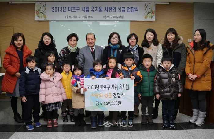 [시민일보]지난 12일 마포구 지역내 20개 사립유치원에서 원아들이 자발적으로 모금한 지역내 저소득가정 지원을 위해 쓰일 성금 650여만원을 구청에 기탁하는 전달식이 열렸다. 사진은 전달식에 참여한 박홍섭 마포구청장(뒷줄 왼쪽에서 네번째)와 유치원 관계자, 원아들의 모습.