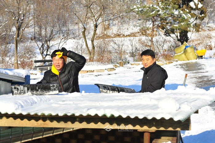 [시민일보]지난 14일 경기 여주시청 홍보감사담당관 소속 직원 20여명이 여주시 북내면 중암리의 노인복지시설 '소망의 집'을 찾아가 쌀, 세제 등의 위문품을 전달하고 제설작업을 하는 등 봉사활동을 실시했다. 사진은 지붕에 쌓인 눈을 치우는 여주시청 직원들의 모습.