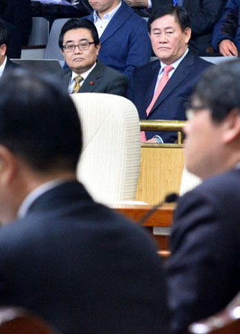 16일 오전 서울 여의도 국회에서 국가정보원 개혁특위 주관으로 열린 국정원 등 국가기관의 정치적 중립성 강화 방안에 대한 공청회에서 새누리당 최경환 원내대표와 민주당 전병헌 원내대표가 참석해 방청하고 있다.