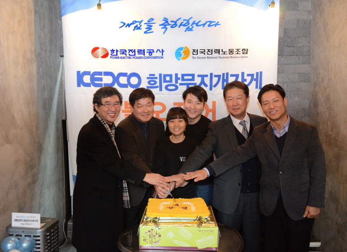 | ▲ 'KEPCO 희망무지개 가게' 오픈 행사에 참석한 사회연대은행 김용덕 대표, 전국전력노동조합 황민수 수석부위원장, 창업자 김수민씨 부부, 한국전력 권춘택 노무처장, 전국전력노동조합 이재복 대외협력실장(좌측부터) | ||