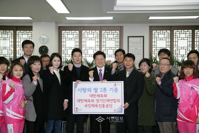 [시민일보]17일 대한체육회 선수위원회와 올림픽 금메달리스트들이 모금한 성금으로 구입한 쌀 2000kg을 서울 중구에 기탁했다. 이 쌀은 지역내 어려운 이웃들에 전달될 예정이다. 사진은 최창식 중구청장(앞줄 왼쪽 여섯번째), 진종오(사격, 앞줄 왼쪽 다섯번째), 양학선(체조, 앞줄 왼쪽 여섯번째) 외 모금에 동참한 선수들의 모습.