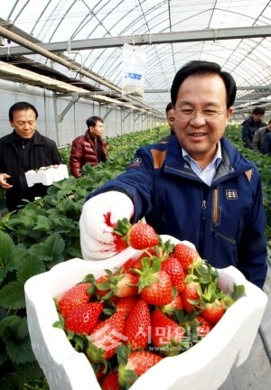 [시민일보]경기 용인시는 지난 17일 용인수출딸기영농조합법인 친환경 딸기 고설재배 시설하우스 5농가에서 올해 첫 수확하는 친환경 딸기 수확 시연회를 열었다. 이날 시연에는 김학규 용인시장이 고설재배 시설하우스에서 직접 딸기 수확 체험을 하고 농업인들의 어려움 및 개선의견 등을 청취했다. 사진은 김학규 시장이 수확한 친환경 딸기를 들어 보이고 있는 모습.