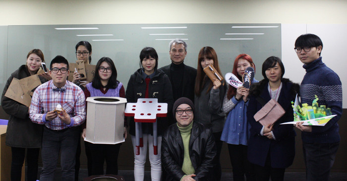서울 성북구 한성대학교에서 최근 학생들이 만든 학교 기념품을 선보였다. 이번 프로젝트에 참여한 제품디자인 전공 '크리에이티브 스튜디오 Ⅱ' 수강생들은 플리플랍, 휴대폰 종이거치대, DIY 종이 램프 등 실용적이고 한성대의 특징을 잘 살린 제품들로 눈길을 끌었다. 사진은 크리에이티브 스튜디오 Ⅱ 수강생과 문찬 교수(중간 아래), 대외협력처 조승호 팀장(중간 위)이 기념사진을 촬영하는 모습.