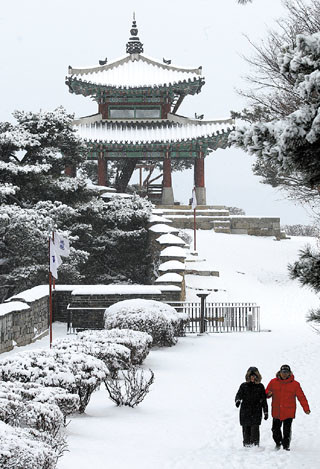 수원을 비롯한 경기남부 지역에 대설주의보가 내린 19일 눈덮인 세계문화유산 화성(華城) 서장대가 한겨울 풍경을 연출하고 있다.