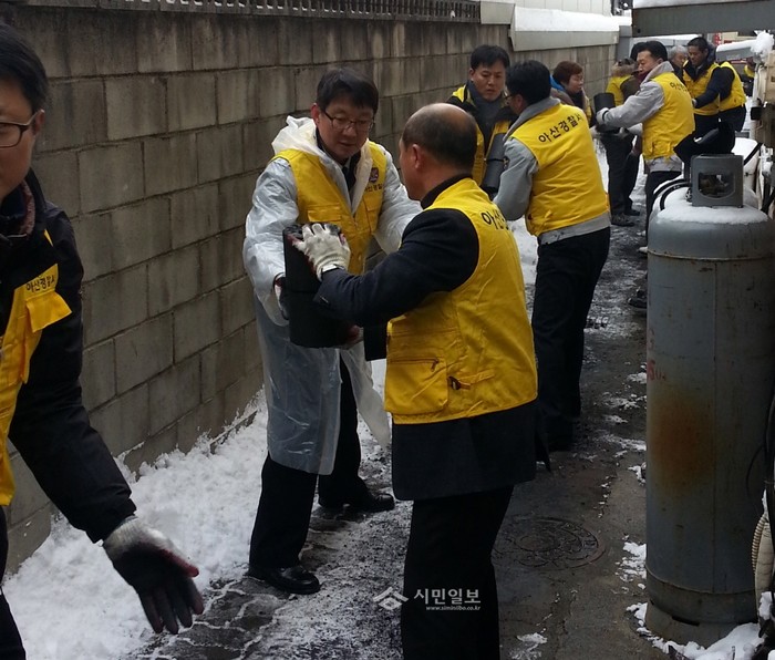 [시민일보]지난 20일 충남 아산경찰서와 경찰발전위원회가 함께 아산시 온천동 지역의 저소득 가구에 연탄 2000장을 직접 배달하는 봉사활동을 실시했다. 사진은 좁은 골목길에서 줄지어 연탄을 나르는 아산경찰서 직원들의 모습.