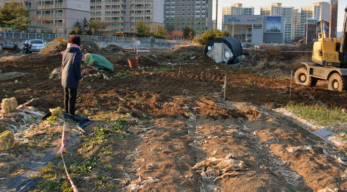 대규모 아파트 건립회사인 지엘 건설(지엘 리베라움)이 지난 19일 오후 경남 밀양시 삼문동 아파트 건립 예정부지 겉흙 제거 과정에서 굴착기를 동원해 인근 경작자가 수확한 무 2000여 포기와 배추, 상추, 시금치 등을 무단으로 훼손해 경작자들의 반발을 사고 있다. /뉴시스