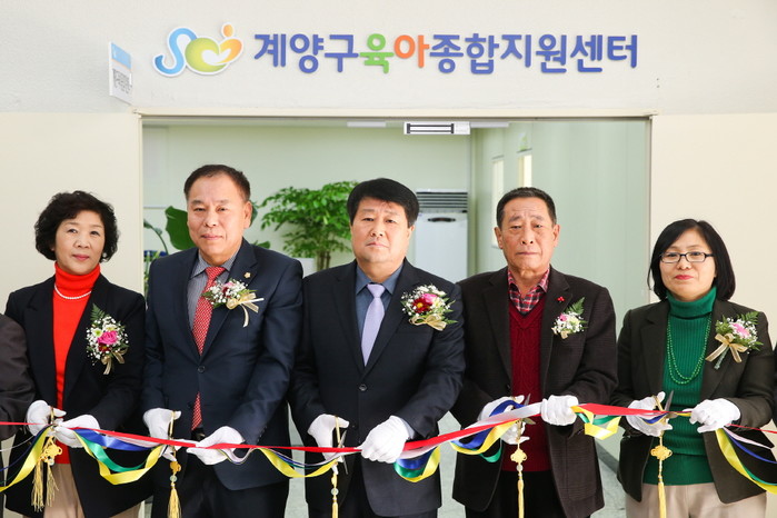 지난 19일 인천 계양구가 계양구 사회복지관에서 계양구육아종합지원센터 개소식을 했다. 이날 개소식은 현판식, 테이프 컷팅으로 시작해 '2013년 스토리텔링 사진공모전' 입상자에 대한 시상과 기념사, 축사 순으로 진행됐다. 사진은 박형우 구청장과 계양구의회 이용휘 의장, 센터 관계자들이 테이프를 자르고 있는 모습.